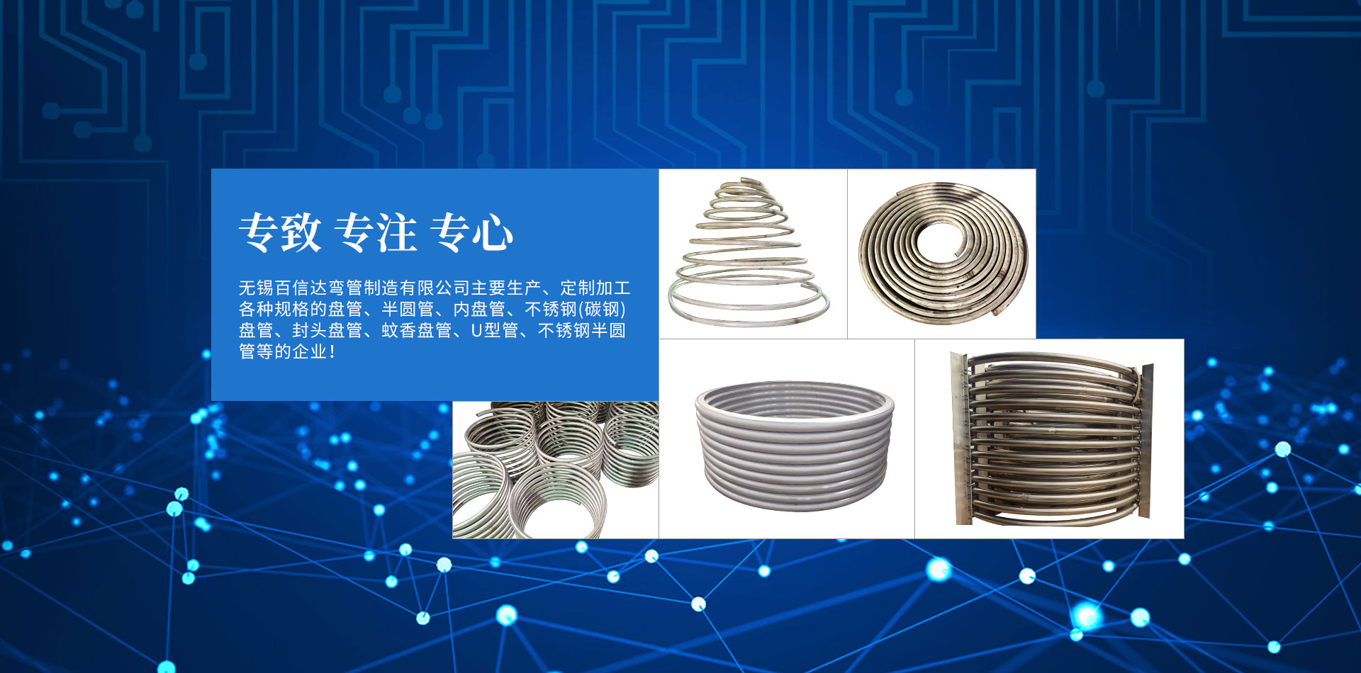 無錫百信達彎管制造有限公司位于經(jīng)濟發(fā)達、風景秀麗的太湖之濱。本公司擁有完整、科學的質(zhì)量管理體系,公司的誠信、實力和產(chǎn)品質(zhì)量獲得業(yè)界的認可。公司專注生產(chǎn)、定制加工各種規(guī)格的盤管、半圓管、內(nèi)盤管、不銹鋼盤管、封頭盤管、蚊香盤管、U型管、不銹鋼半圓管、碳鋼盤管等的企業(yè)。本公司設計加工的彎管設備,質(zhì)量精良、結構合理,效率高、操作簡易、經(jīng)久耐用。公司已經(jīng)承接了各地多個大型場館工程項目的彎管加工,屢次得到了多家大客戶的好評。努力滿足客戶的需要,不斷提高自身水平是公司追求的目標。歡迎社會各界朋友蒞臨無錫百信達彎管制造有限公司參觀、指導和業(yè)務洽談!